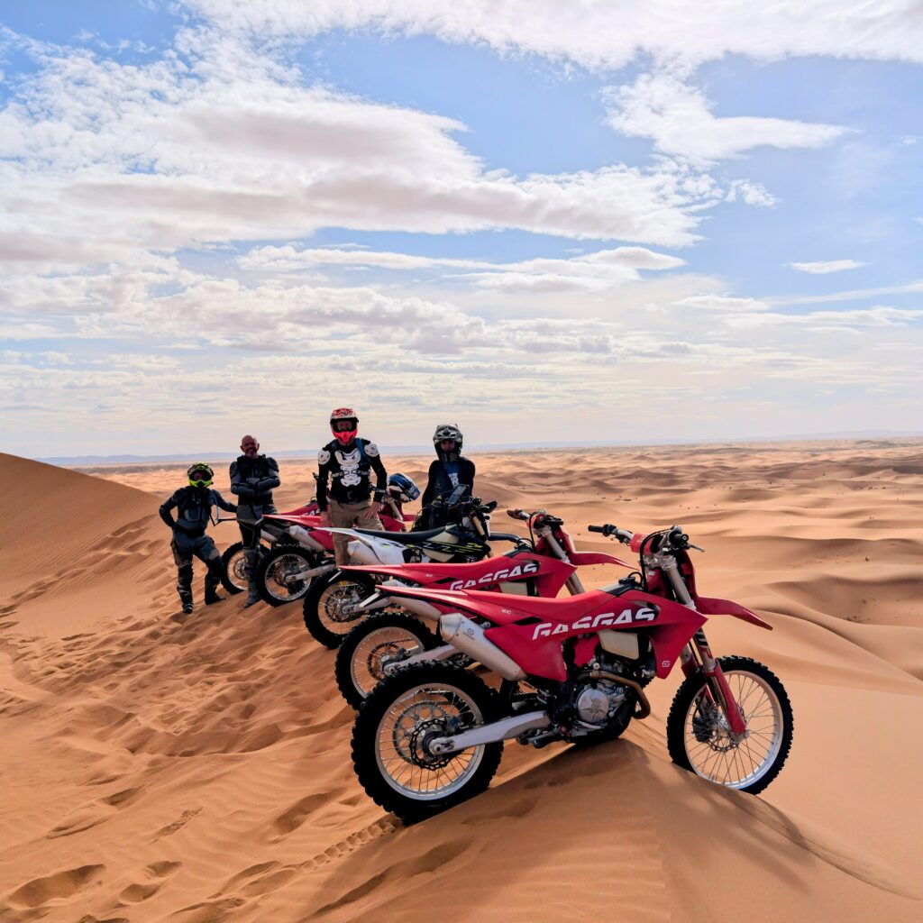 Experience the thrill of cresting the golden waves on your bike in the cool of the morning. With expert instruction, you’ll soon be blasting up 80m tall dunes! Depart the dunes via a legendary Paris-Dakar piste, crossing the cracked expanse of Lac Iriki. The route opens up into fast desert tracks, salt flats, and dramatic rocky plateaus where speed and scenery blend into one. Arrive in the frontier town of Foum Zguid for a well-earned rest, a cool drink, and a taste of authentic southern hospitality – with a pool thrown in to revitalise you from the immense desert crossing.